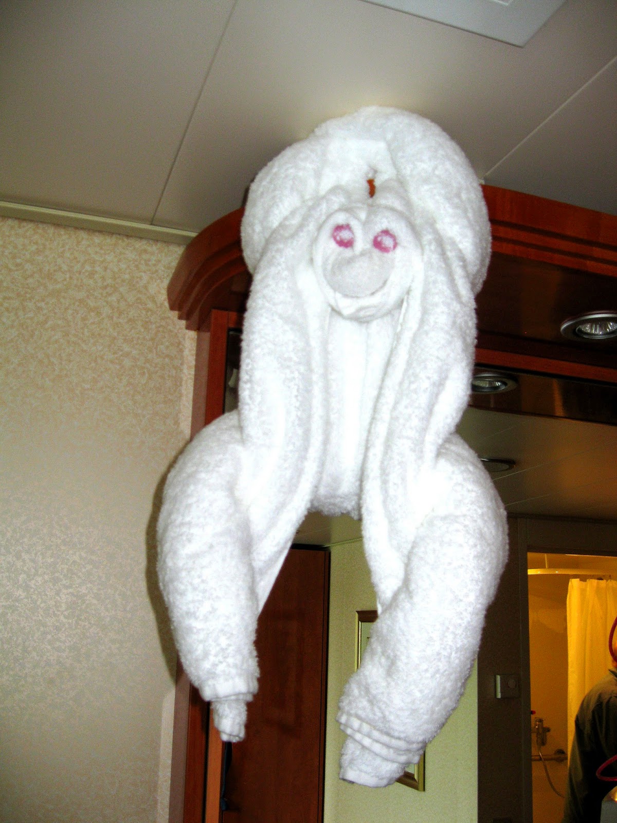 This little guy cracked me up. He turnedup in our room one night aboard the Oasis of the Seas. (Probably a stowaway from the ship's laundry.) |