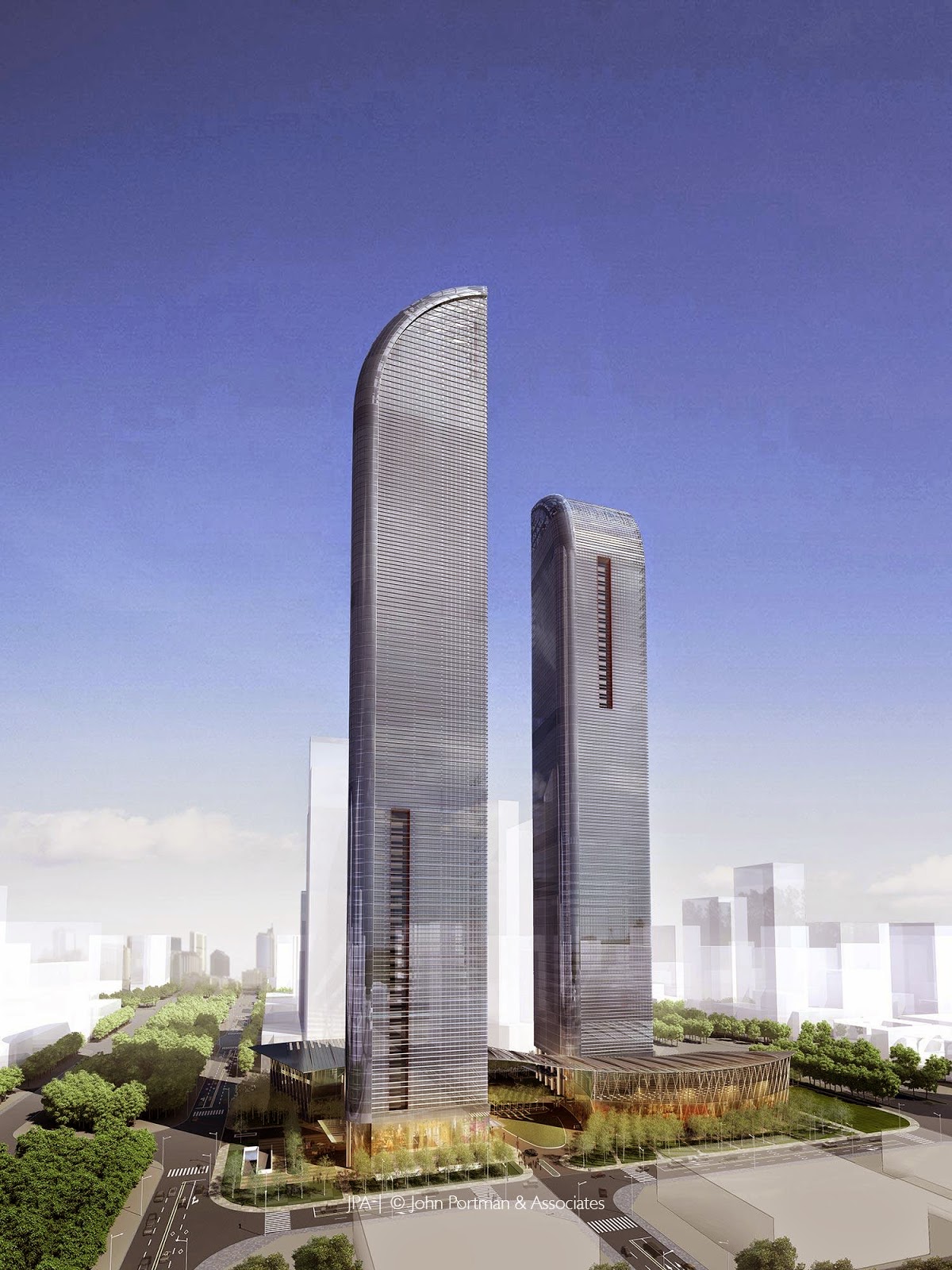 John Portman is now ninety-one years old. In a career spanning nearly fifty-five years, his firm's past, present, and future undertakings are as dizzying in number and conceptual daring as the heights of his trademark atriums. They number more than eighty separate structures, though some are grouped into major urban commercial centers like his original Peachtree Center in Atlanta, and his more famous such grouping, Detroit's Renaissance Center, which consists of seven glass towers (many cylindrical in shape) of varying heights. Today, Portman's hotels and office towers are spread around the world. Many of his firm's current and future projects are concentrated amid China's soaring city skylines. Portman's Greenland Center (right) in Yinchuan, China is typical of his firm's 21st-century undertakings.